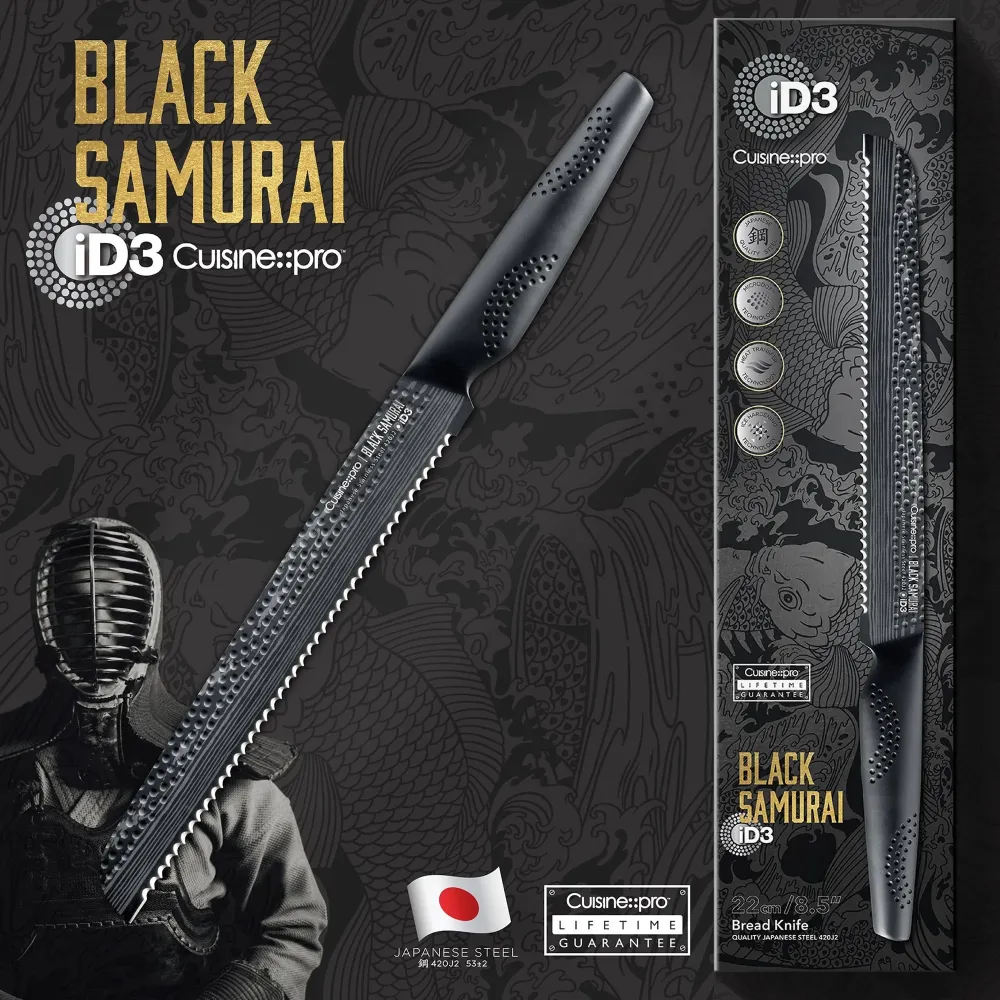 The innovative Cuisine::pro® iD3 BLACK SAMURAI™ collection melds cutting-edge engineering with high-design. Forged from the highest-quality 420J2 Japanese Steel, each coated knife in this high-tech collection is ice-hardened and double sharpened giving it superior durability and precision. The distinctive black matte ceramic coating offers antibacterial properties and protects the blade from stains and wear. The handles incorporates our exclusive MicroDot® Technology, which targets the main pressure points on the hand to ensure comfort and control, even across the toughest tasks.