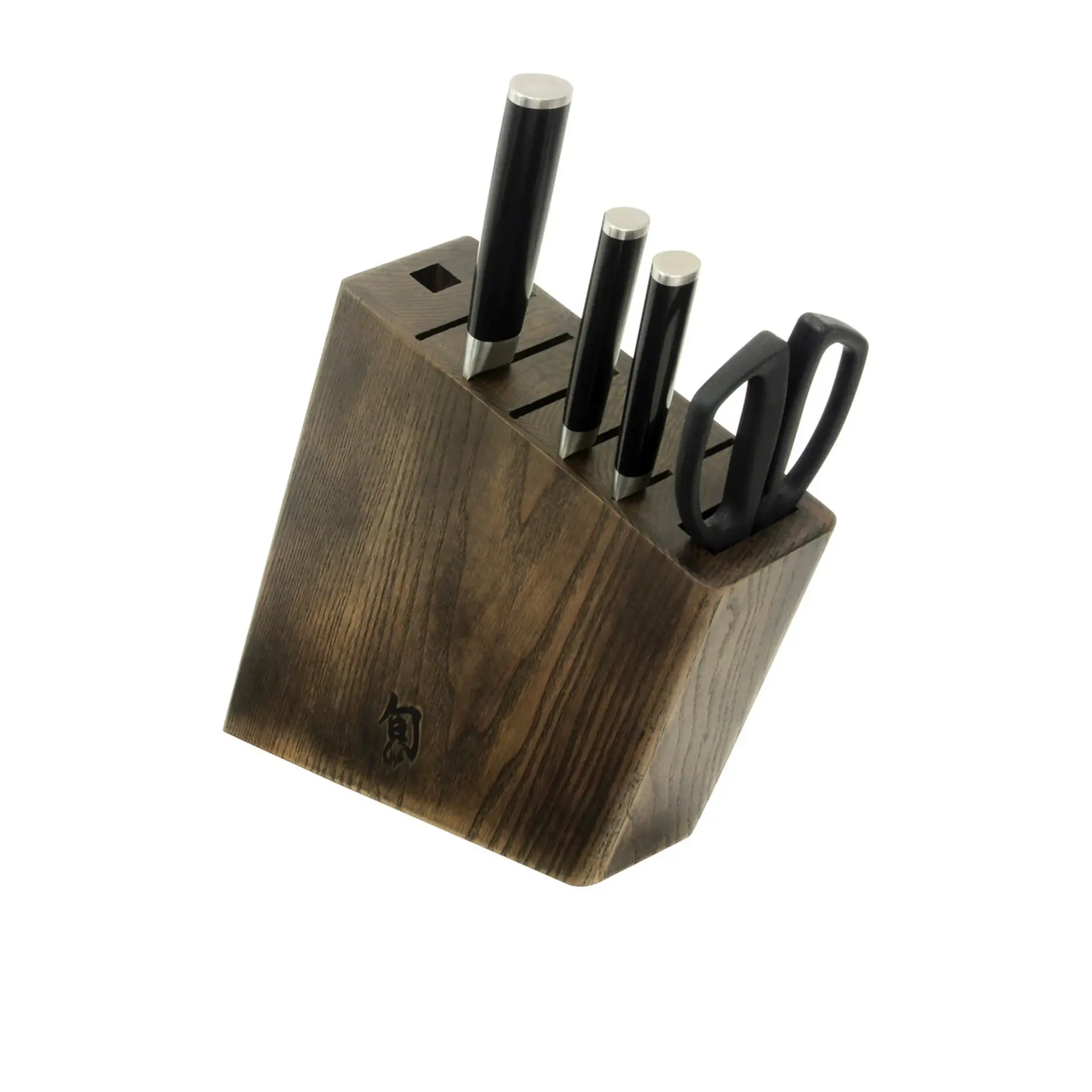 Designed to display your treasured knives at an easily accessible angle this distinctive hardwood knife block comes to you empty so you can present your favourites in the manner you find most convenient. Suitable for Cooks Knives Utility Paring Carving Knife and sharpening steel together with your trusty kitchen shears it has a stable base and bears the iconic Shun logo.