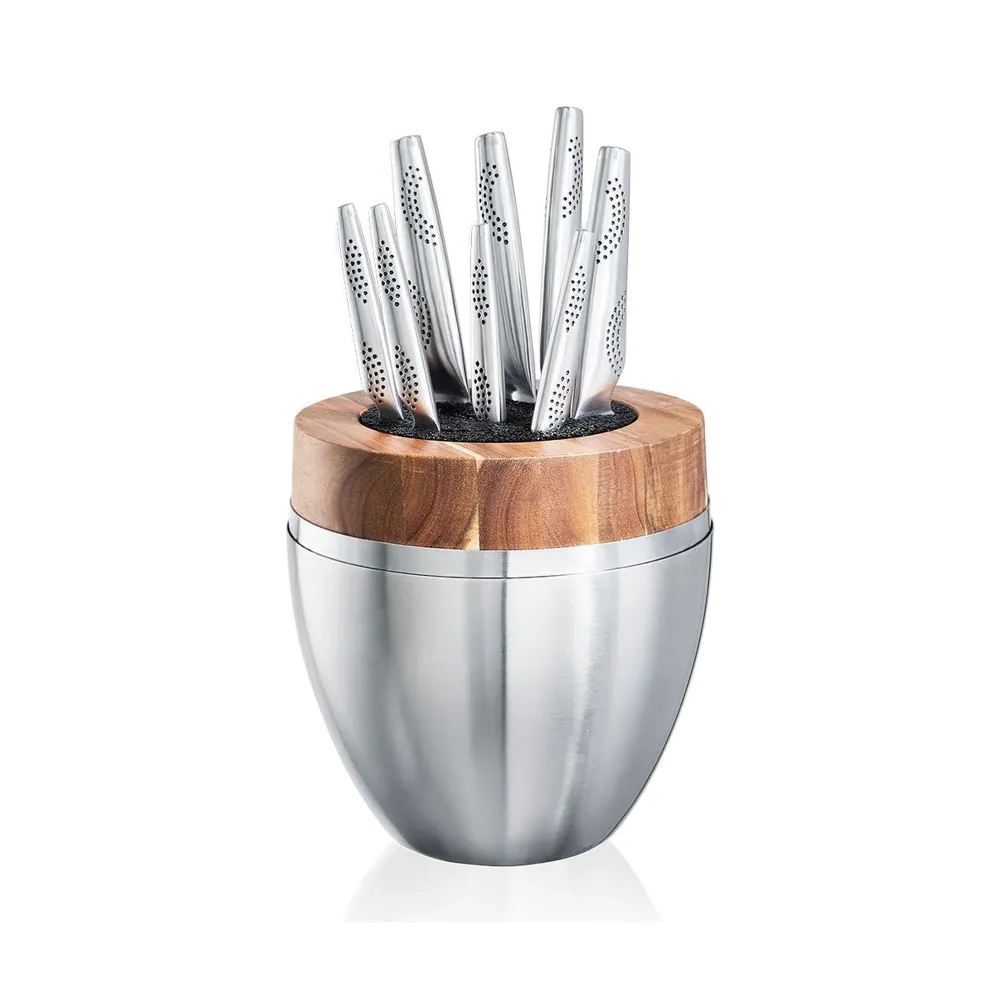 - Set Includes: 8″ chef’s knife, 8” bread knife, 8″ carving knife, 6″ santoku, 5″ santoku, 4″ serrated utility knife, 4″ utility knife, and a 3.5″ paring knife, all housed in a stunning block set features a unique and trademarked egg shape, crafted from the finest quality stainless steel with a chic satin finish.