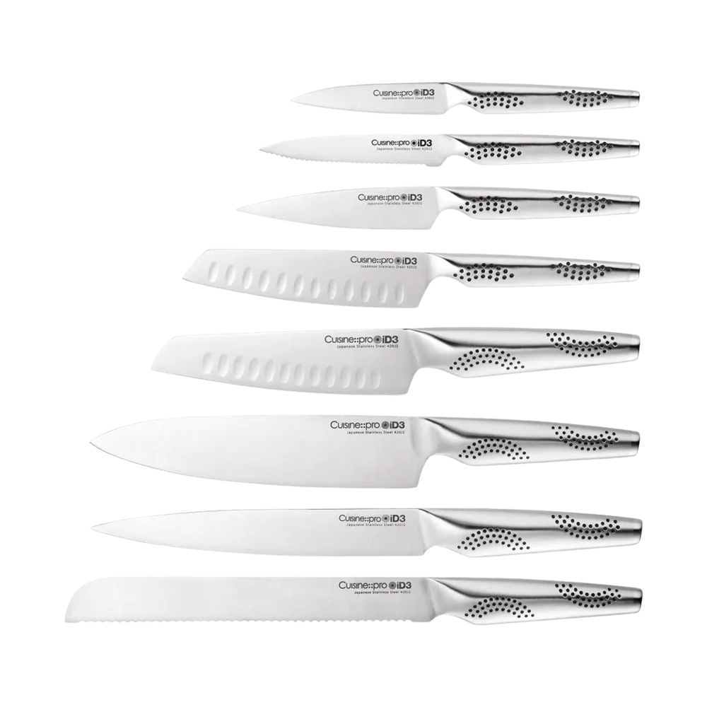 The Cuisine::pro® iD3® collection is a high-performance range engineered for precision slicing, dicing, and mincing—all in an exceptionally lightweight design. Forged from Japanese 420J2 steel and ice-hardened for enhanced strength, each knife is precision-crafted from a single piece of stainless steel with a weighted hollow handle for perfect balance and control. Our exclusive MicroDot® technology targets key pressure points on the hand, providing a secure, comfortable grip for no-slip confidence.