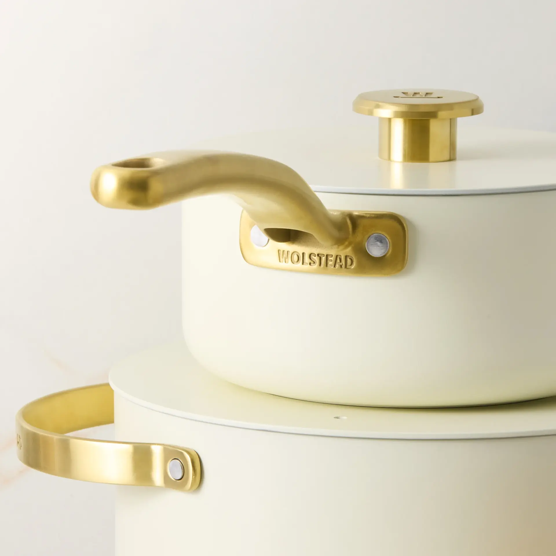 Completely free from PFAS, PTFE, PFOA, lead, and cadmium, Ceramax™ offers a healthier, more natural alternative to traditional non-stick, with a smooth finish that allows food to glide and release with ease. Crafted from heavy gauge aluminium for fast, even heat distribution, every Wolstead Mineral piece is built to perform, and impress. The cast stainless steel handles stay cooler for longer and are finished in a striking brushed gold, ensuring the pans look as good in your kitchen as they do on your table, making this collection the ultimate oven to table cookware. Set includes an 18cm saucepan with lid, a 24cm casserole with lid, a 26cm frying pan and a 28cm sauté pan with lid.